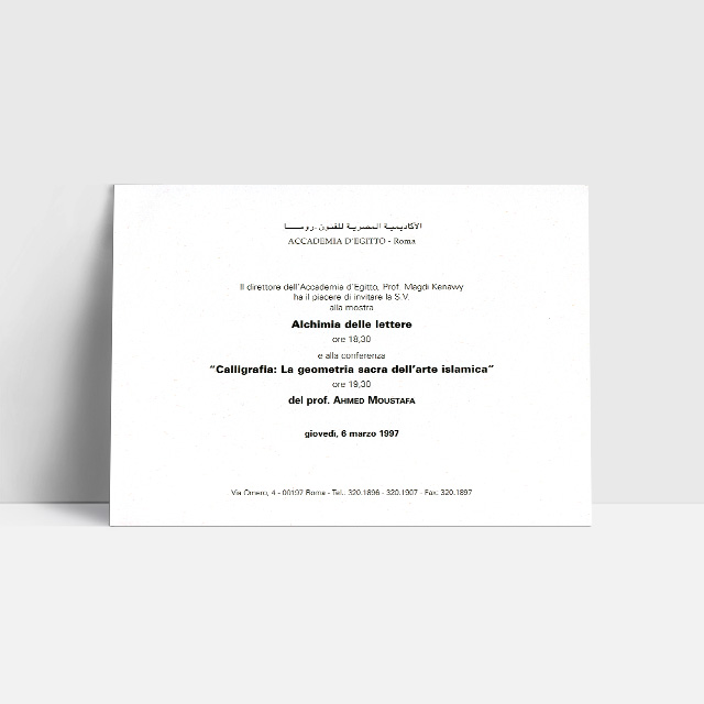 Invitation card to ‘Alchimia Delle Lettere’ Exhibition, Roma, 1997. Italian text.