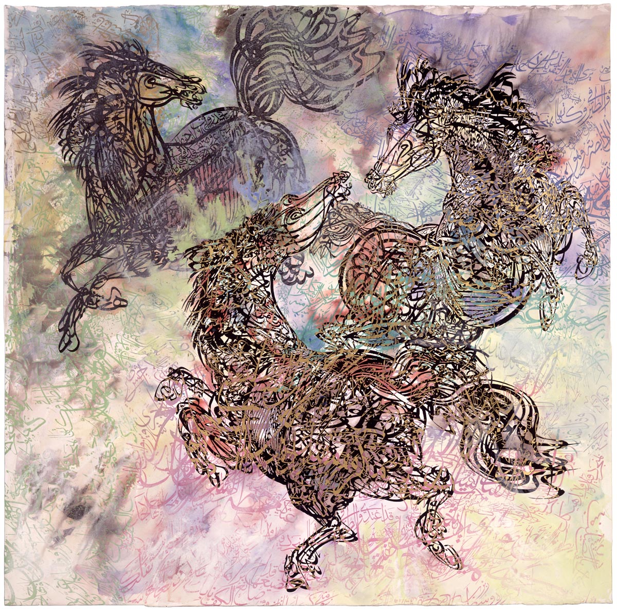 The Arabic lettershapes, which form the basis of Ahmed Moustafa’s work, should not be regarded merely as arbitrary graphical forms or structural devices manipulated to create images. It is sometimes tempting to think of them in this way, especially when the texts are virtually unreadable even to a speaker of Arabic, as in Three Jesting Horses (1994) where the letters have almost completely melted into the visual palette. For any Muslim, the letters of Qur’anic verses are sacred in the sense that they are constituent elements of the revealed Word; in addition, for Ahmed Moustafa the actual proportions of the Arabic letter shapes themselves are of profound significance, and are the subject of a remarkable piece of research carried out over more than three decades, for which he was awarded a Ph.D. degree in London (1989) by the Council for National Academic Awards.